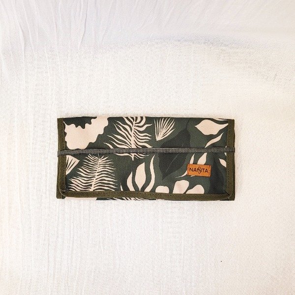 Tiene un bolsillo con cierre, 5 elasticos para colgar las cadenitas o pulseras, un porta anillos con velcro y una red para que coloques todos los aritos que desees.
