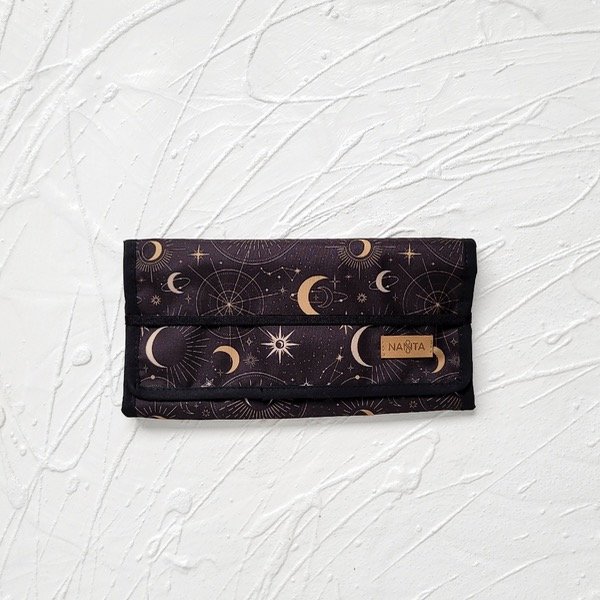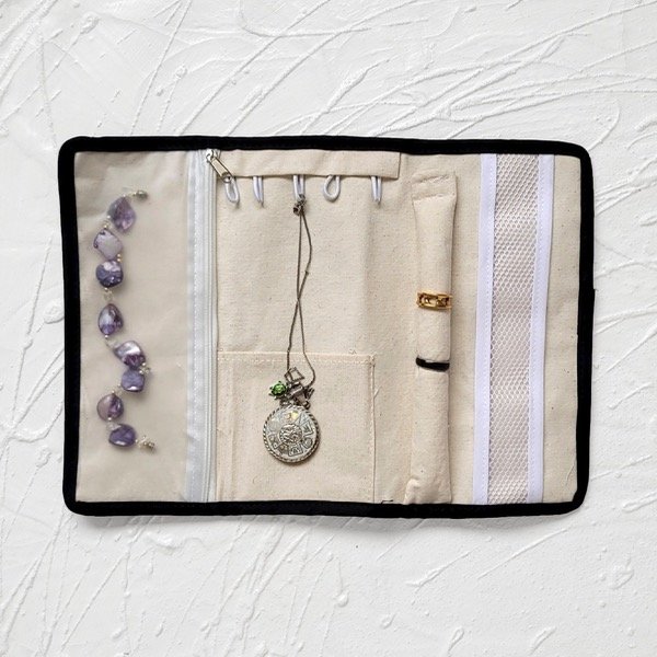 Tiene un bolsillo con cierre, 5 elasticos para colgar las cadenitas o pulseras, un porta anillos con velcro y una red para que coloques todos los aritos que desees.