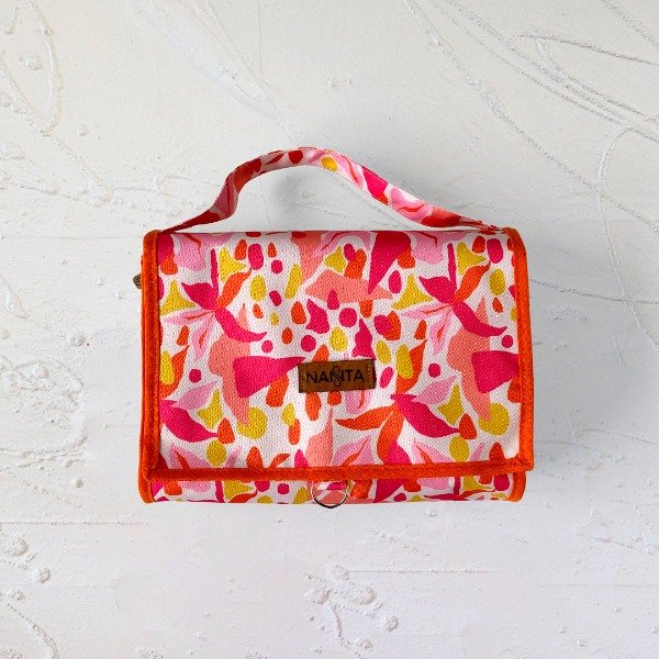 El aliado perfecto para tus viajes. Trae en su exterior un herraje metálico que te permite colgarlo con una percha o de algún ganchito, y a su vez una manija para trasladarlo fácil.